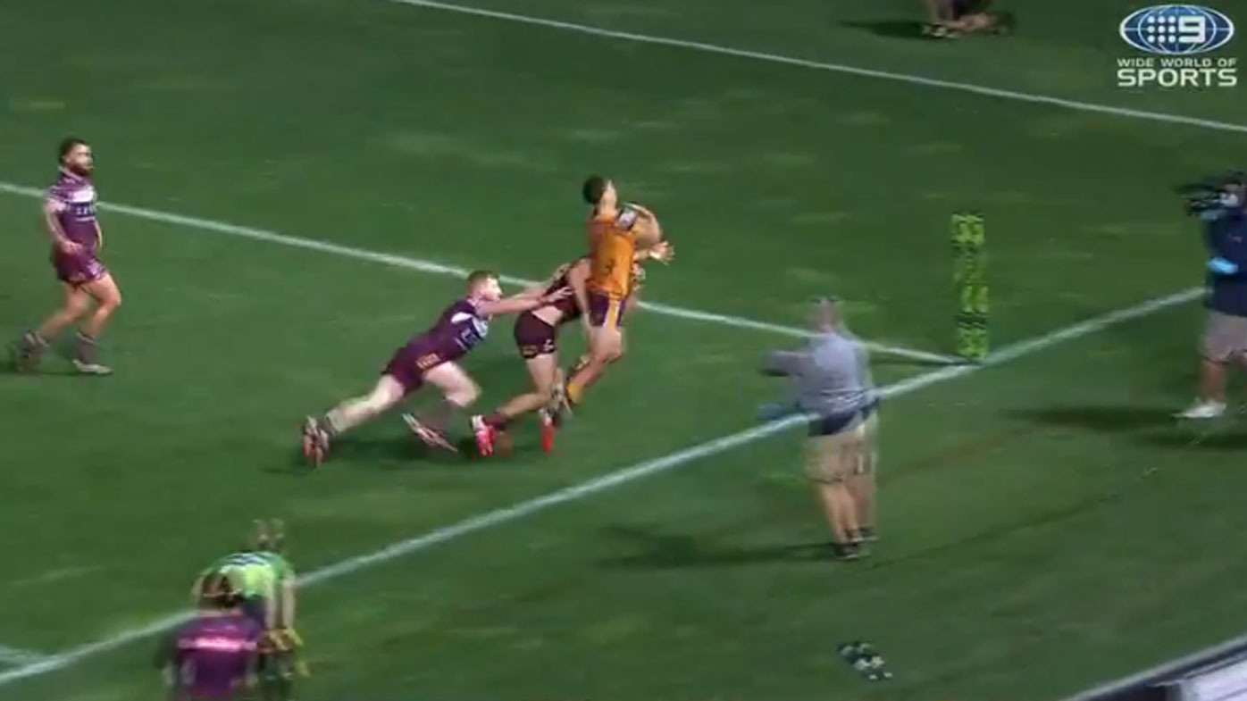 The Broncos winger came off second best as the Manly No.1 made the tackle bundling him into touch, effectively ending Brisbane's chances.