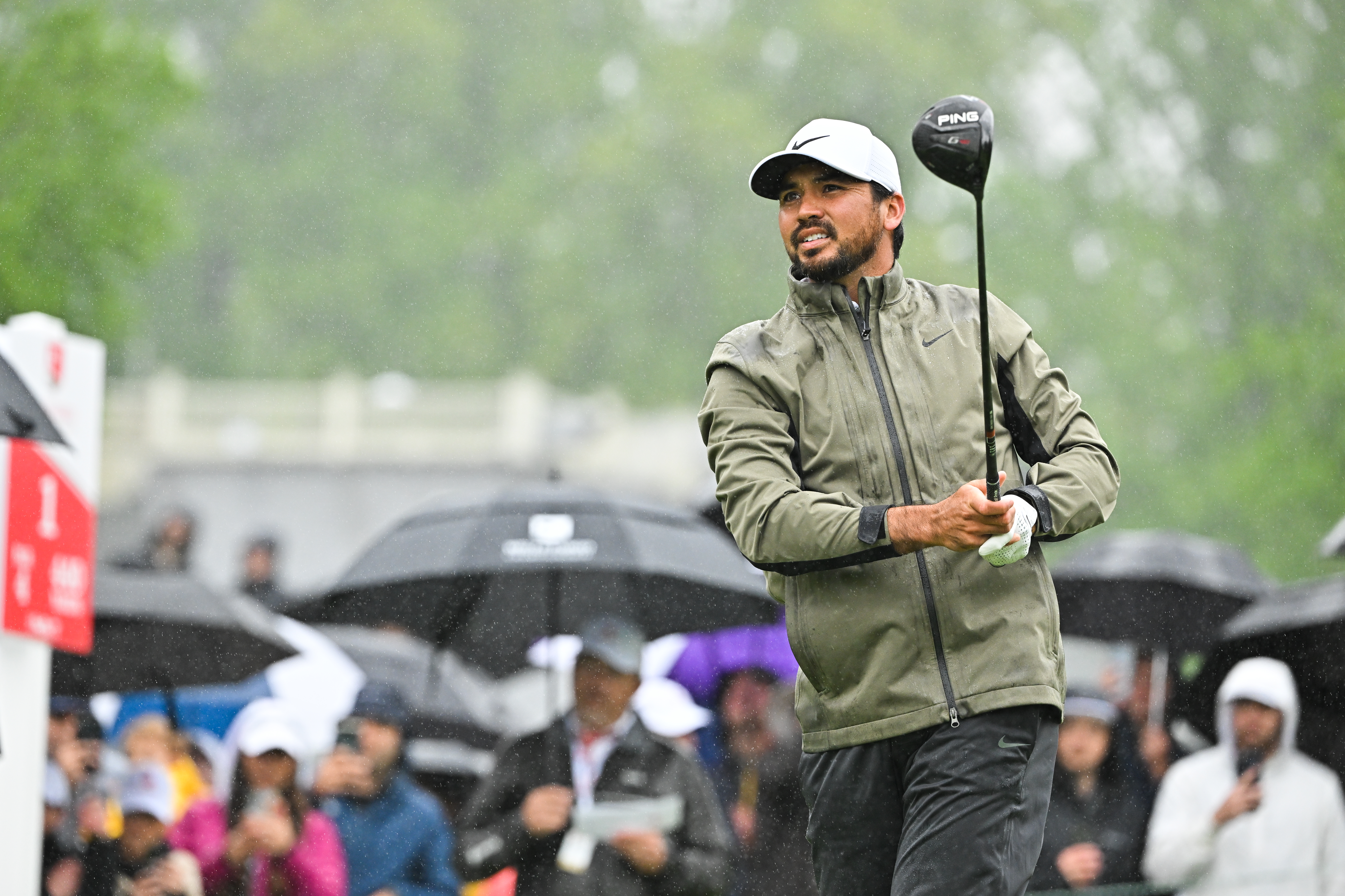 Day appeared to lose his grip on the club when he hit another hook into a water hazard with his second shot on the par-5 10th, even though he had half a dozen gloves hanging from the ribs of his umbrella. He shot 79 to fall seven shots off the lead.