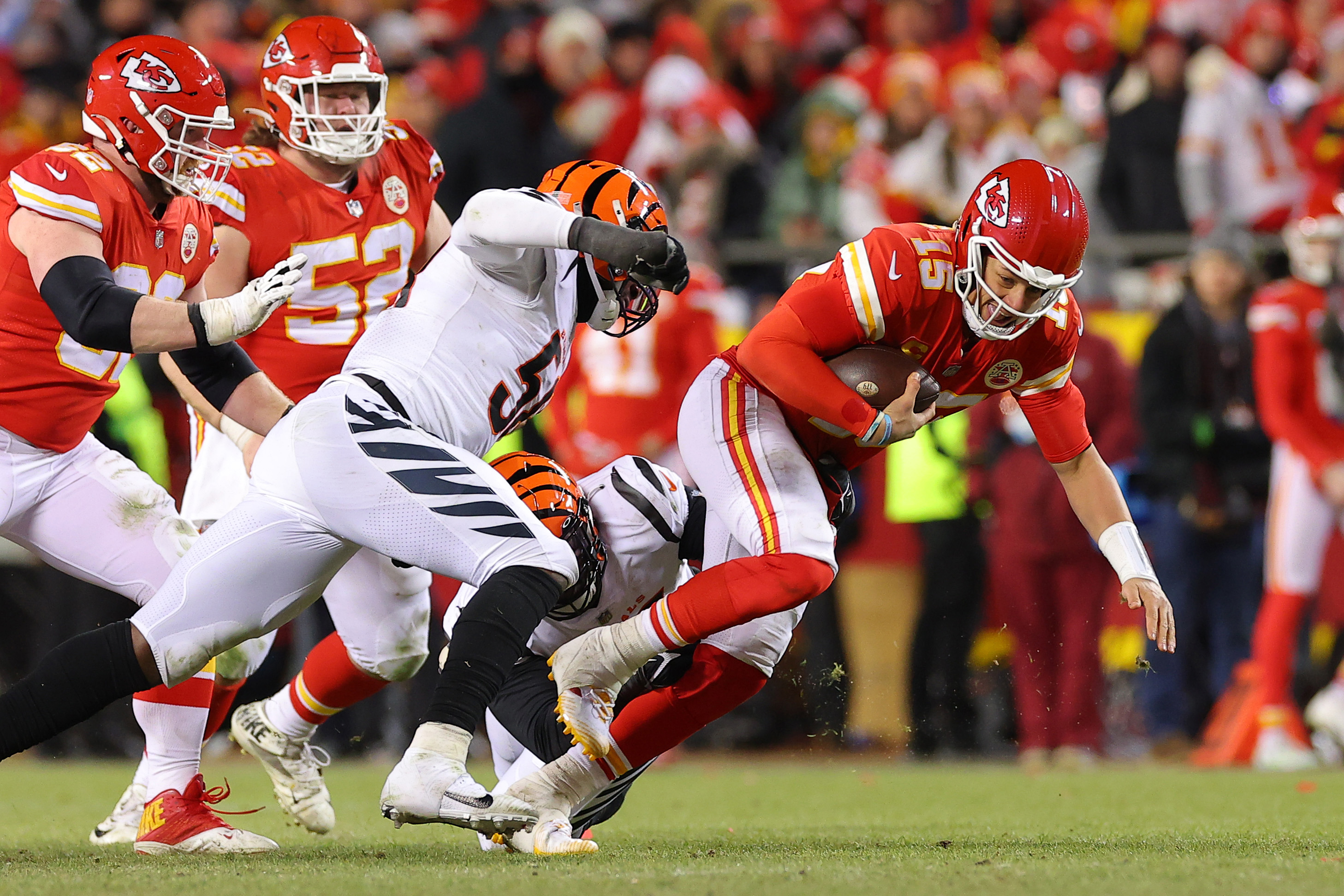 The Chiefs got a crucial sack from Chris Jones to force a punt with 39 seconds left, and shaky return man Skyy Moore broke free for 29 yards on the return. On third-and-4 at the Bengals' 47, Mahomes eluded pressure and scrambled toward the Bengals' sideline, barely picking up the first down before Ossai gave him a shove from behind.