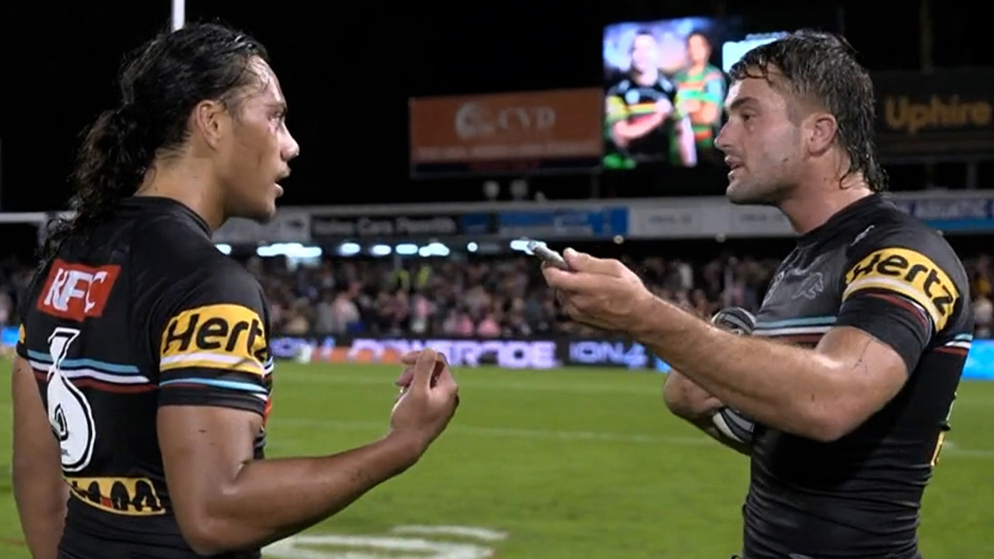 Cameras spotted Panthers teammates Jarome Luai and Jaeman Salmon in a heated argument following Penrith's season-opening defeat to Brisbane on Friday night.