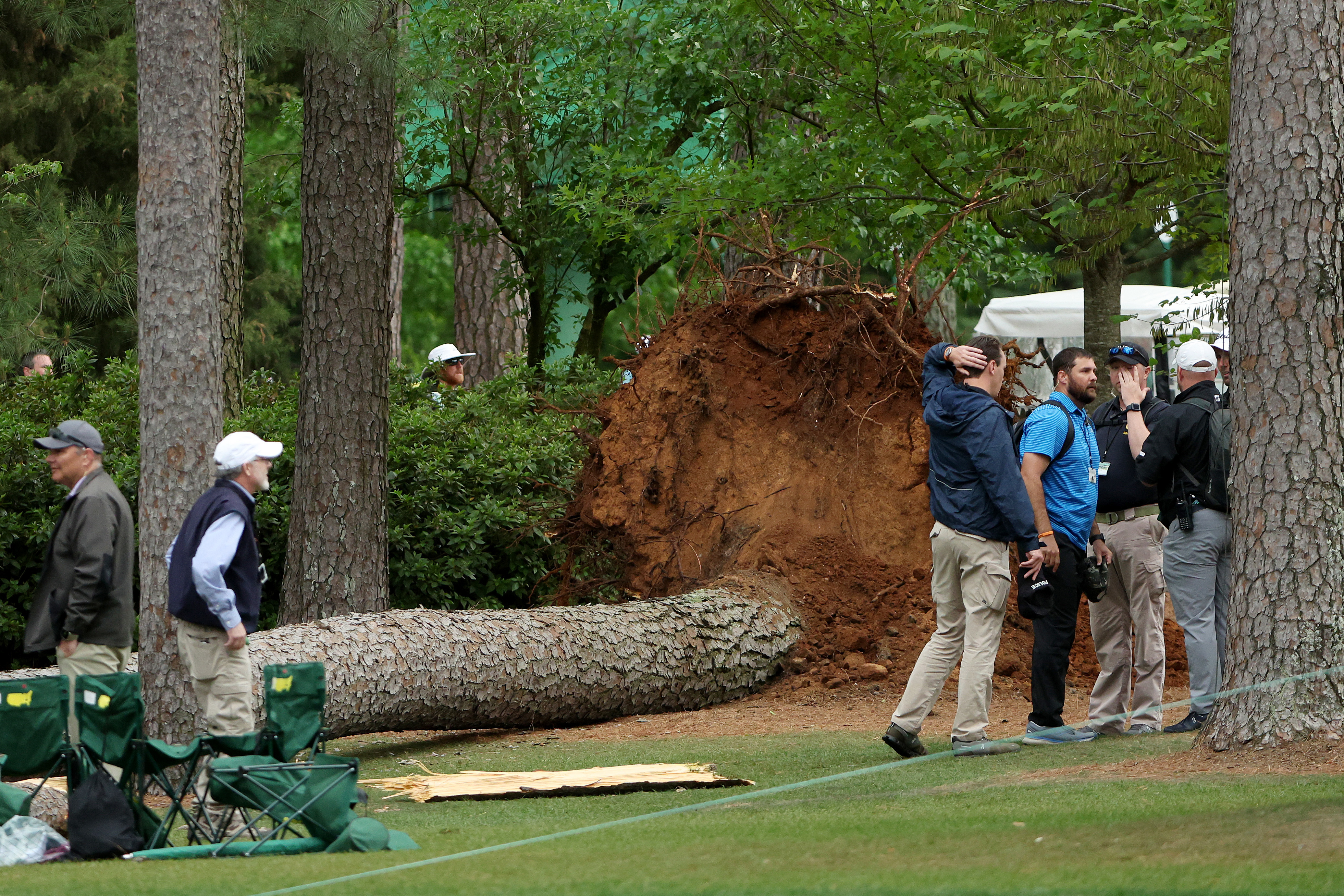 There have been terrifying scenes at the Masters after wild weather caused multiple trees to be uprooted with the play eventually suspended for the day.