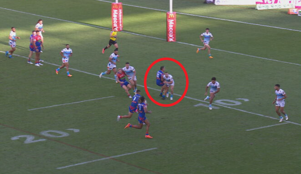 The centre ran through a hole created by Tyson Frizell after the Knights' second-rower ran to the inside shoulder of Kieran Foran.