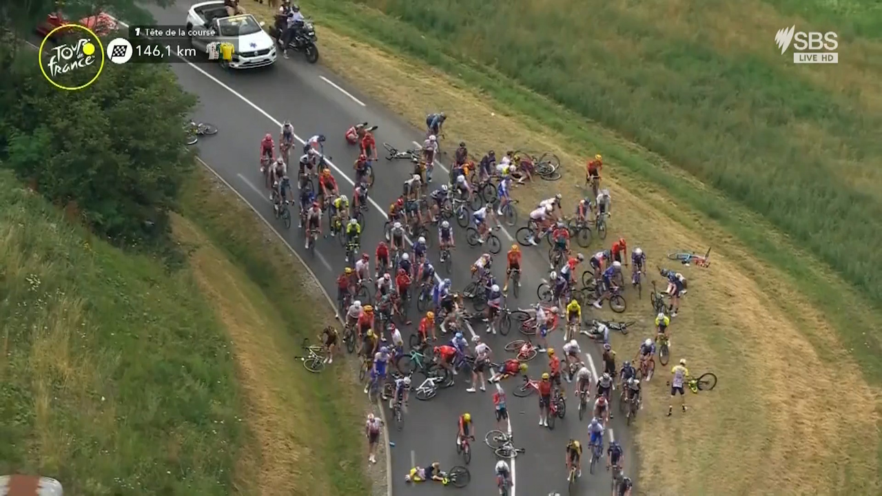 The start of the 14th stage of the Tour de France was marred by a massive pileup only about 5km after the start.