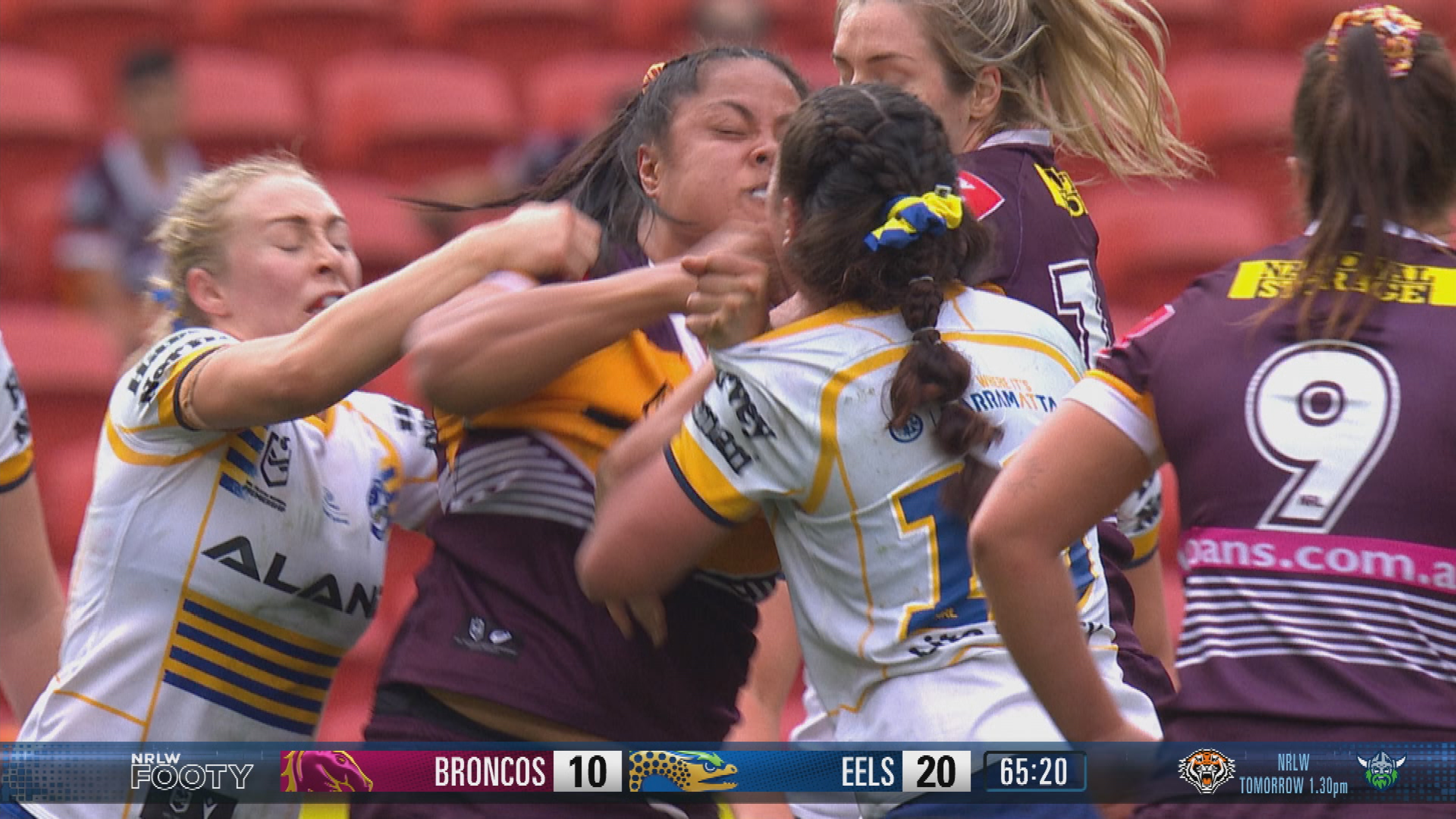 Broncos star Annetta-Claudia Nu'uausala was lucky to only be binned after an ugly brawl late in their NRLW season-opening loss to the Eels.
