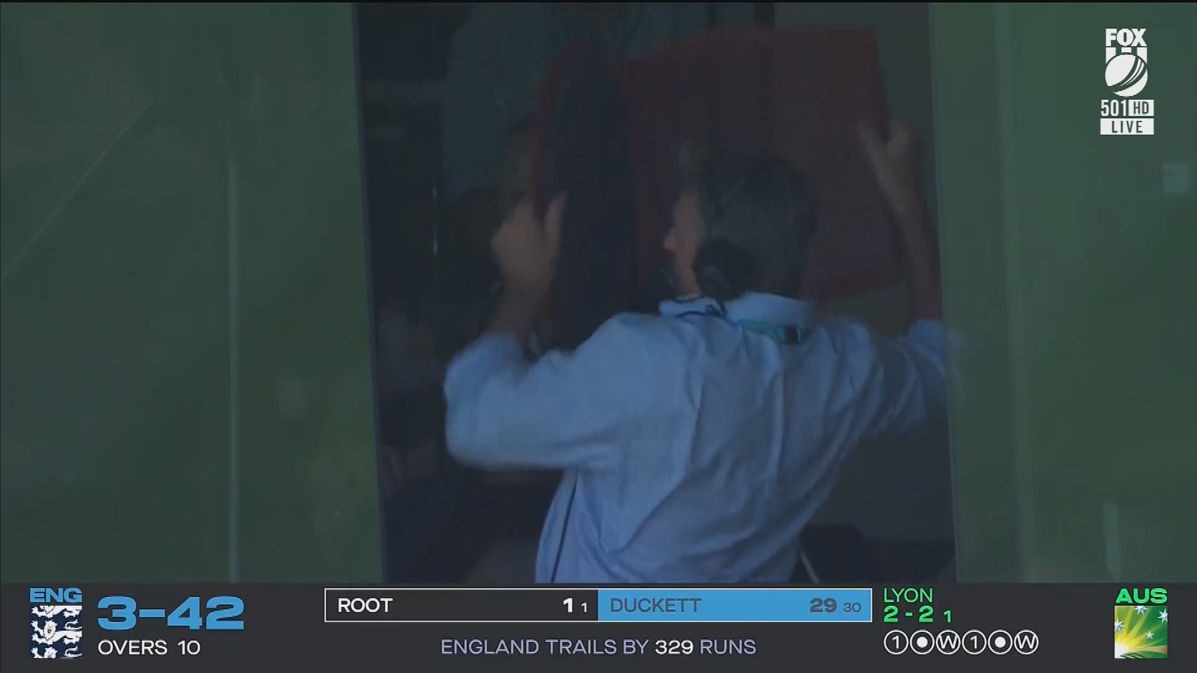 After Duckett was bowled, cameras panned to McGrath who humorously picked up a chair and pretended to throw it while on commentary for the BBC. Simon Katich was in the box next to him, laughing.